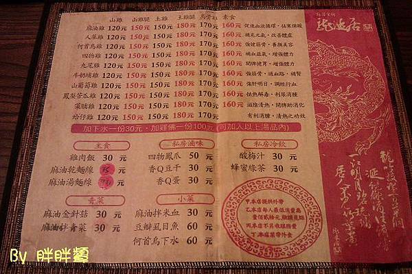 有沒有看到有好多種雞膳選擇:麻油雞、人蔘雞、何首烏雞、四物雞、九尾雞、牛奶燉雞、山葡萄雞、鳳梨苦瓜雞、菜餔雞、蛤仔雞。每一種口味還有山雞、山雞腿、土雞、土雞腿、烏骨雞還有素食的選擇耶~