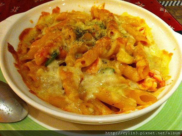 你看看照片,蝦子數目還不少哩!熱滾滾冒著煙氣的奶油撲在筆管麵上,沿著碗緣微焦的起司更勾引食欲了,一整個看起來格外好吃~