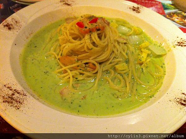 聽說綠色奇蹟不是一般的青醬用羅勒製作,而是百分之百菠菜做的喔~所以感覺起來有些水水的,但仍然很入味卻也較清爽;不過麵條的部分有些可惜,就是一般般少了些特色。
