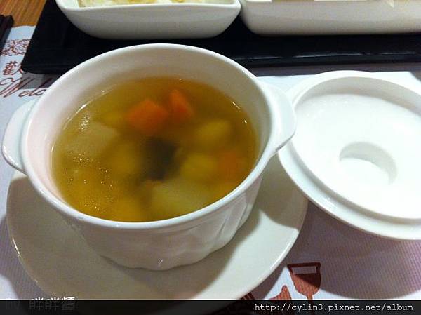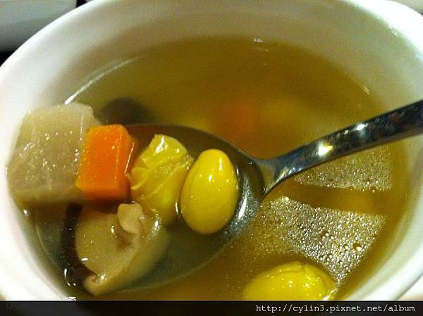 首先上桌的是湯,我的天,竟然有白果耶! 有別於一般餐廳會上的玉米濃湯、羅宋湯、紫菜蛋花湯…,竟然是白果、白蘿蔔、紅蘿蔔、香菇…熬煮的綜合湯,白果費用不低,對女生很好,聽說對於記憶力也很棒!小時候老媽要煮白果,我還得幫忙把一個會苦苦的東西去掉,超費工的,不知道現在還需不需要這麼麻煩的手續或是中藥行就會幫忙?!但是Anyway~老闆娘光是一個小小湯就如此重視,真是令我太訝異了!也更加期待後續的餐點。