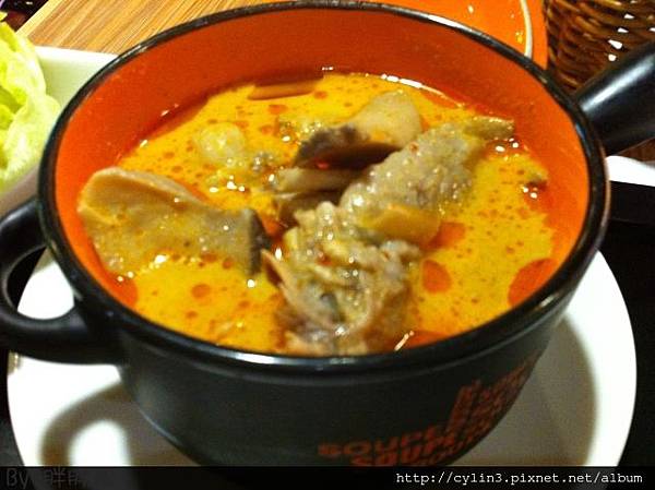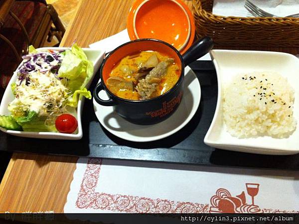接下來上桌的是Stan點的泰式紅咖哩雞,這道菜聽說是人氣菜色,左邊是營養價值很高的生菜沙拉,可以解咖哩的膩;中間黃橙橙的咖哩超香的,稍微微辣,很下飯,肉很嫩,老闆咖哩給的很大方,Stan忍不住還加了一碗飯。