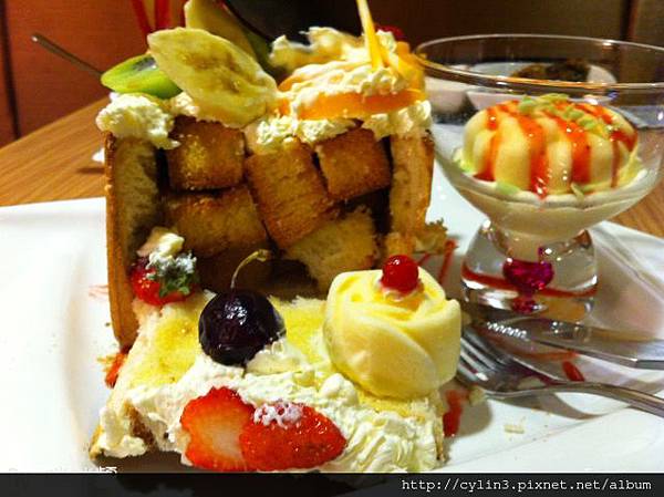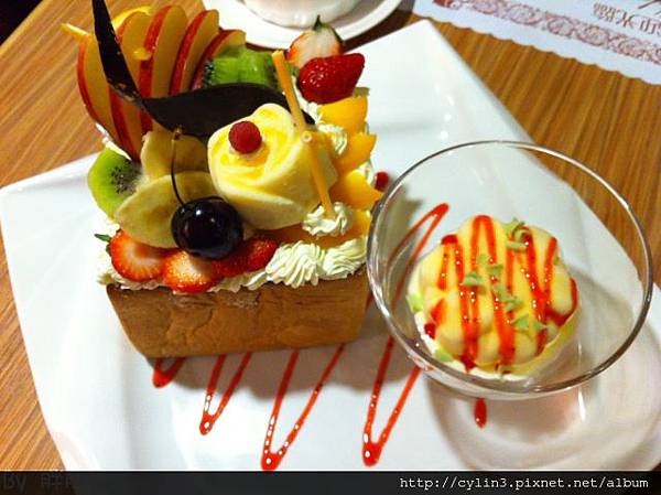 託sam的福,老闆娘特別端出店內超受歡迎的蜜糖土司招待我們,喔~My God!你瞧瞧那吐司上滿滿精緻的水果(草莓、蘋果、奇異果、香蕉、櫻桃…),竟然還有朵漂亮的玫瑰花狀的冰淇淋,另外還有吃起來很像是卡士達的冰淇淋,讓已經超飽足的我,忍不住又嘴饞了起來。