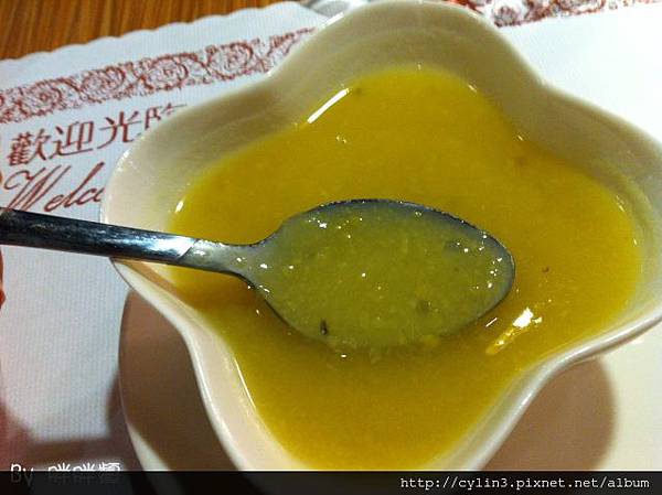 這是附餐甜點,聽說每日也都會變,今日是綠豆蒜西米露,甜而不膩,而且主廚把露豆蒜跟西米露打特別再打細,讓口感更順口。