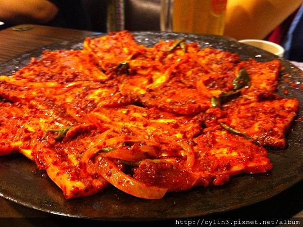 登登登~老闆推薦的辣五花肉(NT$350)上場囉~每塊豬五花都被泡菜辣醬醃製過,因此吃起來有點辣,但偶仍忍不住一口接一口哩!嘖嘖~寫到這,偶口水都快流下來了!好想再去吃一次...