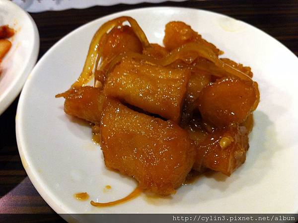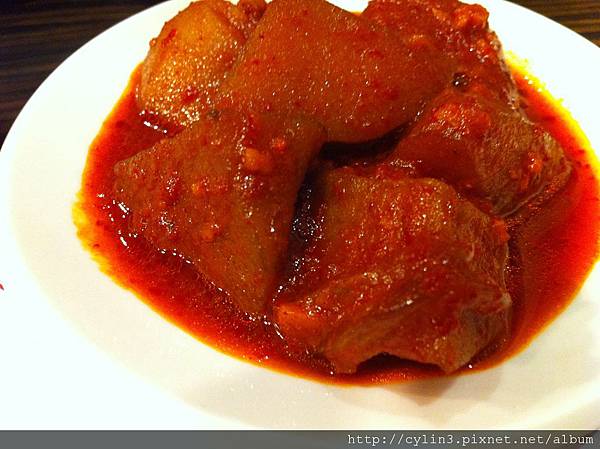 這小菜是醃馬鈴薯,外表看起來很辣,但實際還好,馬鈴薯很新鮮,被辣醬包裹著很好吃喔~我們隨後還忍不住加點哩!