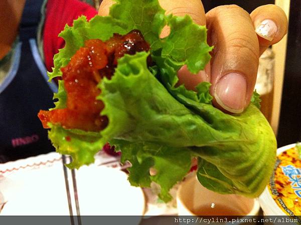 Amy姐姐示範用生菜包著吃,只有一個字形容-讚啦!