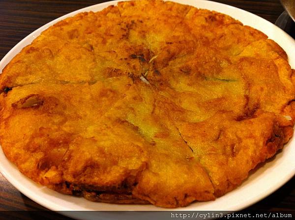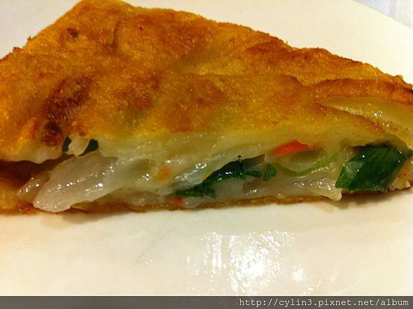 來一張近拍,海鮮煎餅裡面其實藏了不少蔬菜哩!兩個人吃一盤超飽足的......