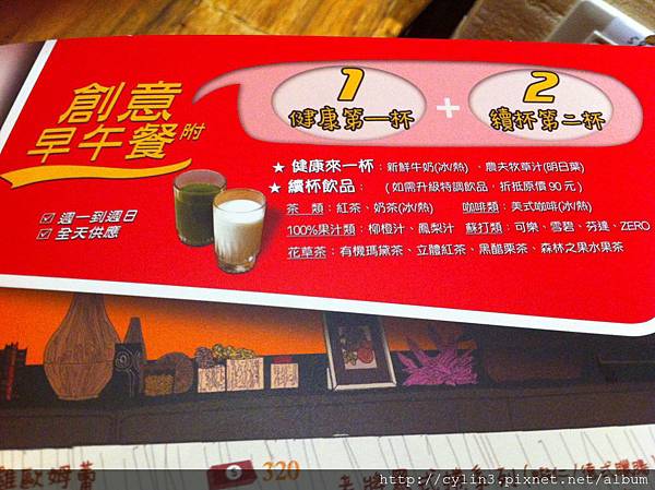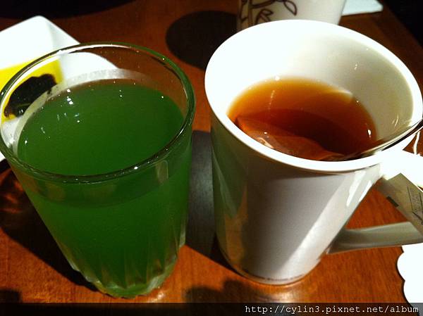 右邊是我請服務生隨餐點就送上的續杯第二杯,可供挑選的飲品滿多的,我選擇了最淳樸的紅茶(怪怪隆冬~一點都不是偶胖胖顰的風格)。