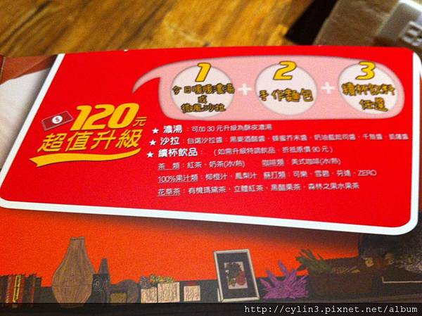 另外~加NT$120可以升級套餐噢~會增加1.今日暖暖濃湯或微風沙拉 2.手作麵包 3.續杯飲料任選。