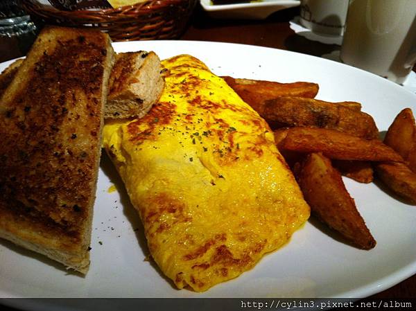 我點的「總匯活力歐姆蕾」,老實說有些失望,怎麼少了第一次去「小貳樓」點餐的驚喜感,不知道是不是因為沒有盤子滿滿的視覺效果,有點烤焦的土司與零星的馬鈴薯薯條,雖然歐姆蛋部分也是很好吃,但是一大塊吃到最後竟然有些膩,覺得好可惜啊!或許店家應該在考慮加點水果或蔬菜來調味一下會更棒!