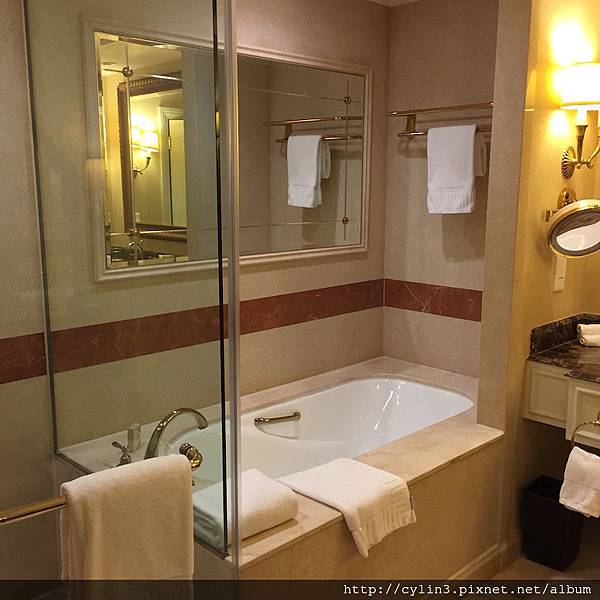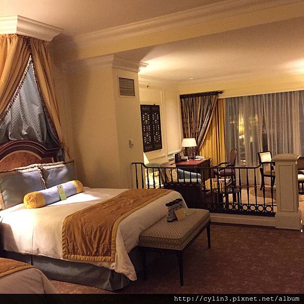 由於人數的問題,其他同仁都是住四人一房的貝麗套房,只有我跟E同住兩人一間的皇家套房,其實感覺是一樣大的,只是貝拉套房有兩張大床,皇家套間是一張大床,因為胖胖顰忘記拍照了^^照片是同事分享給我的,就讓大家參考參考囉~(照片中的星巴克杯子是胖胖顰公司主管特別準備的禮物,非威尼斯度假村酒店準備的呦~千萬別誤會了!)