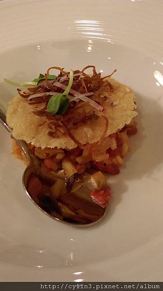 鮮茄義米燉飯襯帕瑪善乾酪松茸芽菜,這道好像又是隱藏料理,我只能跟大家說..好。吃。極。了!