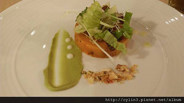 這道菜就是吃食材原始的鮮甜滋味,特選地瓜加上堅果與新鮮蔬菜,搭配少許油醋,十分健康!旁邊那抹綠~聽說是酪梨!酪梨上那三點應該是優格吧?!(太小點了,胖胖顰吃不出來...orz)