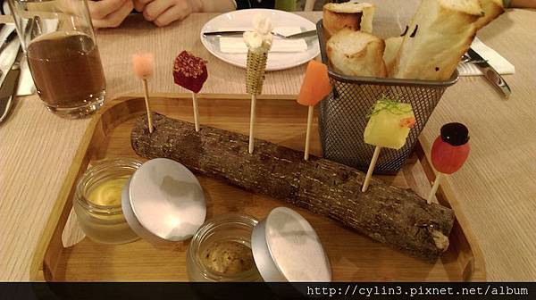 這道料理還包含了佛卡夏麵包,這日店家安排的抹醬是地瓜夏威夷果抹醬與豆鼓蒜味抹醬,抹醬擺在玻璃罐內乍看像是呈上了乳霜哩!第一道料理就讓我們忍不住相機一直吃美食啦~哈...