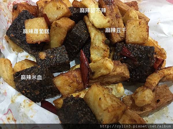 麻辣拼盤內有:蘿蔔糕、甜不辣、豆干、米血,搭配四川麻辣醬,很好吃~整個超適合當下酒菜的!