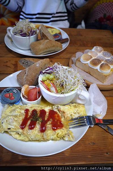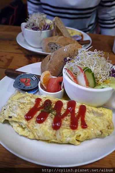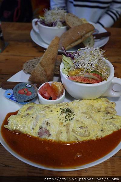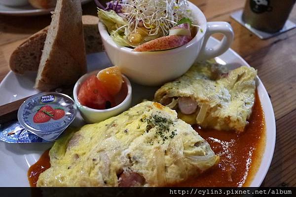 一端出有點嚇到,份量不小耶...除了肉醬德腸歐姆蛋捲,還有沙拉、水果、雜糧麵包;