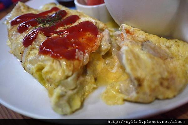 軟嫩的蛋汁包了不少的德國香腸與洋蔥還有杏鮑菇,沾上鮮紅的番茄醬,令人食指大動!