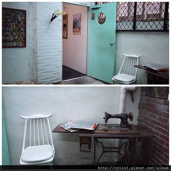 貫穿前後兩棟的穿堂,是廁所的區域,不知道為什麼這兒有令人懷念的腳踏裁縫車@@?