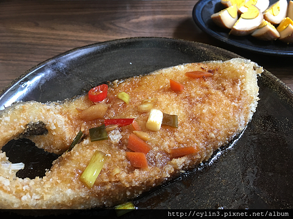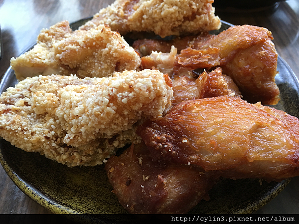 雞腿(單點:NT$100,套餐:170),有分裹粉與不裹粉,價錢都一樣,各有擁護者,有陣子我很喜歡裹粉的雞腿,口味偏甜但覺得外皮好香酥內肉好juice呀~有陣子我又很喜歡不裹粉的,覺得更能吃出老闆將肉醃過的好滋味,嗯...好啦我很善變,但不管怎麼善變,五棧小館的雞腿就是好吃極了!