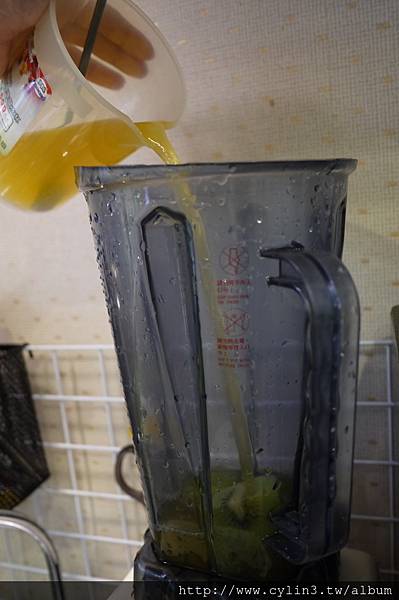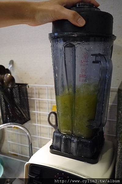 把整顆奇異果放進果汁機內,倒入配好甜度的茶,