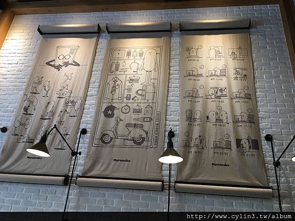 另一面牆壁高掛可愛的插畫,長得很像大拇哥的人物是「年終8個月」的插畫主角,