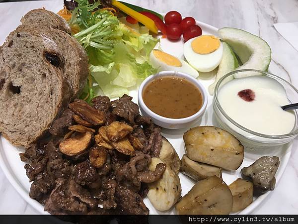 澳洲牛肉搭配烘烤蒜片,炒菇、水果蔬菜沙拉、歐式麵包、優格與咖哩醬,滿滿一大盤,端上桌時,朋友驚呼會吃不完,但最後還是吃光光啦~(笑)