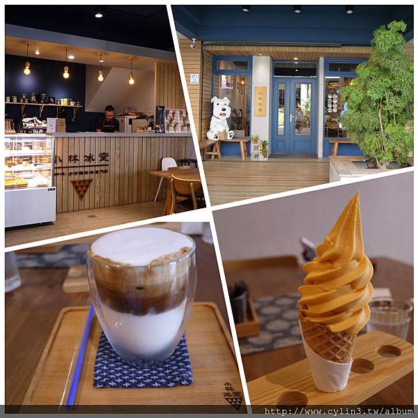 揮別「羅東林業文化園區」彎進旁邊小巷,今天住宿的宜蘭羅東民宿「Ibebe+」竟然就在旁邊耶,但...偶發現有一家店門口坐了一隻大狗狗,忍不住推門進入這家「小林冰堂」,很有特色的小店販售著當季的霜淇淋、冰品與飲品,還有蛋糕甜食;Janice姐姐點了一杯榛果拿鐵(NT$95),但我覺得應該比較偏卡布奇諾了,奶泡讓整杯呈現漸層感,雖然很細緻,但奶太多了啦~