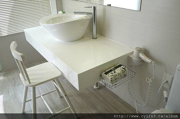 盥洗室提供了與201輕法意雙人房對比的白色化妝椅,