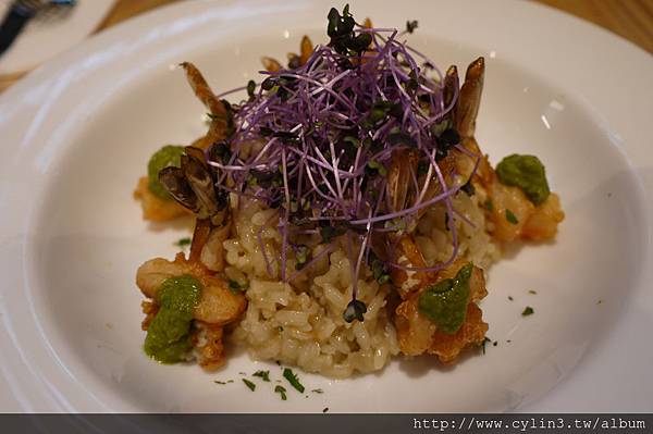 濕潤口感的燉飯很好吃,顆顆分明的米飯軟硬適中卻又吸足了美味的湯汁很入味,搭配半剝殼的鮮蝦與些微青醬佐味,令人好幸福。