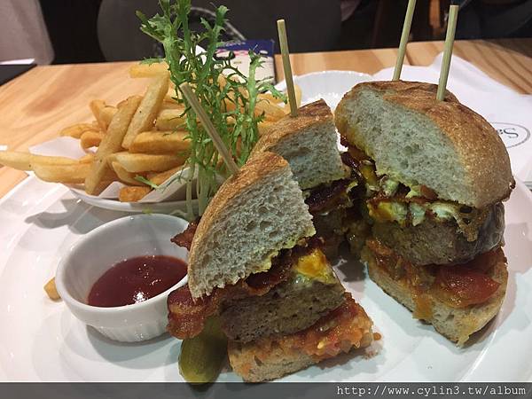 你瞧瞧這牛肉的厚度可不是一般店家可以比較的,搭配培根、半熟蛋、格魯耶爾起司與醃漬綠番茄,更顯多汁美味,十分扎實令人有滿足感。