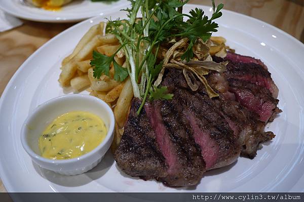 12盎司的美國進口肋眼牛排煎至5~7分熟(若沒有特別吩咐店員熟度),嘟嘟好是我跟幾位同行親友能接受的熟度(ㄜ...我好怕有血的那種><),這「松露荷蘭醬肋眼牛排」根本直接吃就很好吃,灑點鹽巴也超提味的,搭配的Sarabeth特別秘製調配的松露荷蘭醬食用也另有多層次風味,松露荷蘭醬拿來沾一旁的杏鮑菇與薯條吃,更意外無敵超美味!大家一口接一口根本停不了手,頻頻問店員這醬可否單獨購買XD