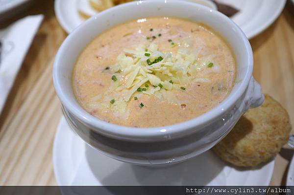 濃稠的奶油蕃茄濃湯超暖胃的,還附上一塊店家自製的比斯吉,很有飽足感喔~