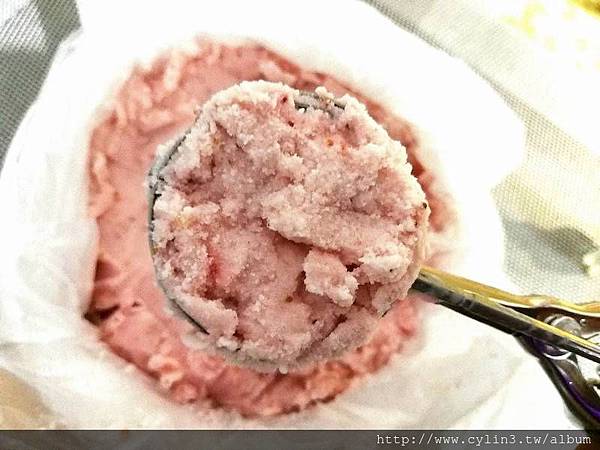 看得到草莓籽的「草莓歐蕾」冰淇淋,入口還能吃到碎草莓果肉,感覺很重成本哩!