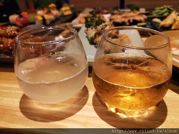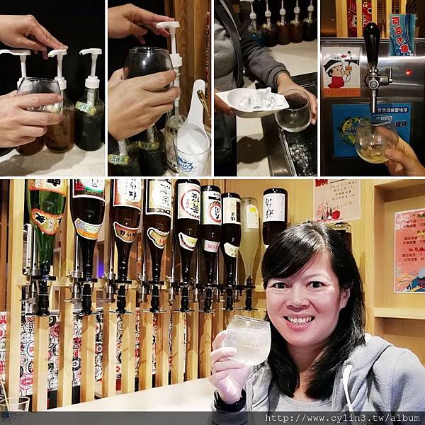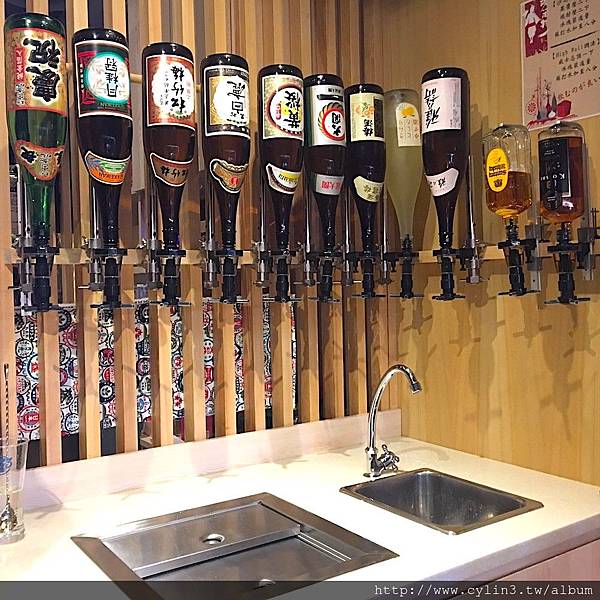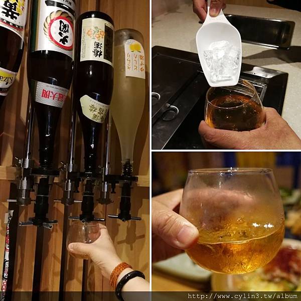 瞧瞧~酒類很豐富:串燒店常見的日本清酒、女生喜歡的梅酒與柚子酒,高濃度的威士忌...等,你只要挑選想的酒,把杯口靠近酒瓶口下方,往上壓5秒後鬆開,視個人要喝的量反復幾次添加,最後再依個人喜好加冰塊即可!
