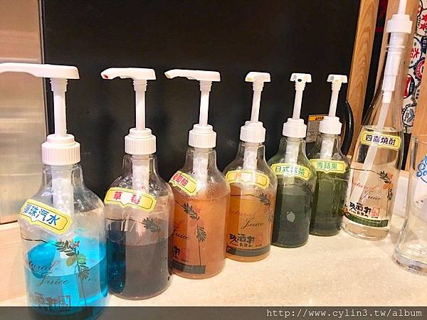「玖酒井 食事町(大安店) 」的酒暢飲喝到飽方案「東京飲爆」最吸引人的就是這個飲品DIY區啦~大部分的居酒屋、燒烤餐廳、串燒店的酒暢飲喝到飽都是由店家為你服務,但是「玖酒井 食事町(大安店) 」推出的飲品DIY區有近十種酒類、威士忌、氣泡飲品、可爾必思...等等,除此之外,還提供約六種果醬供您調味製作,你想喝啥請你自己來吧~是不是超酷炫的!我跟Janice拿著「東京飲爆」專屬的不倒翁杯玩的、喝的不亦樂乎~