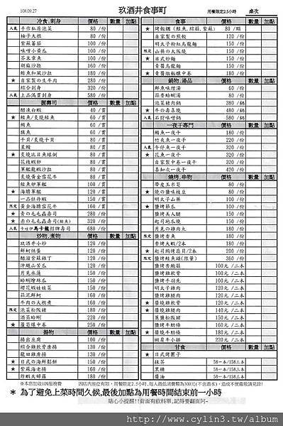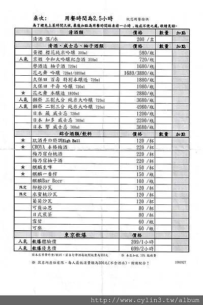 「玖酒井 食事町(大安店) 」用餐有限時2.5小時,每人有低消:NT$300(不含水酒),會另外加收10%服務費,最後加點為用餐結束前一小時,若自行帶酒每瓶開瓶費:NT$300,因為剛開幕精美菜單聽說還在製作中,這日看到的是精簡版^^,大家可以參考下方菜單圖片。