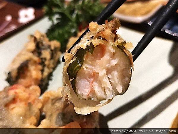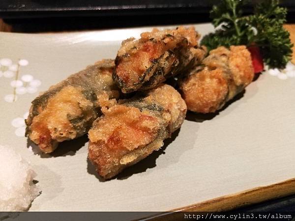 紫蘇葉包裹著完整一尾的鮮蝦海鮮漿,炸得酥酥脆脆,搭配旁邊的蘿蔔泥一起享用,可口極了!
