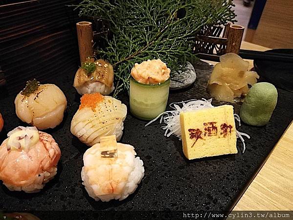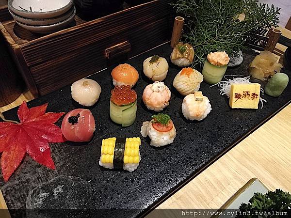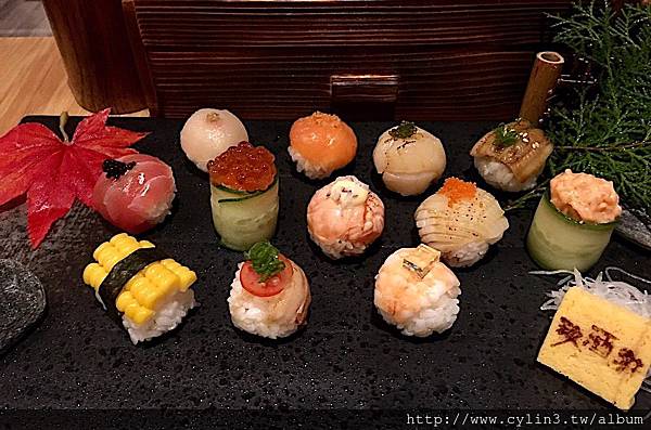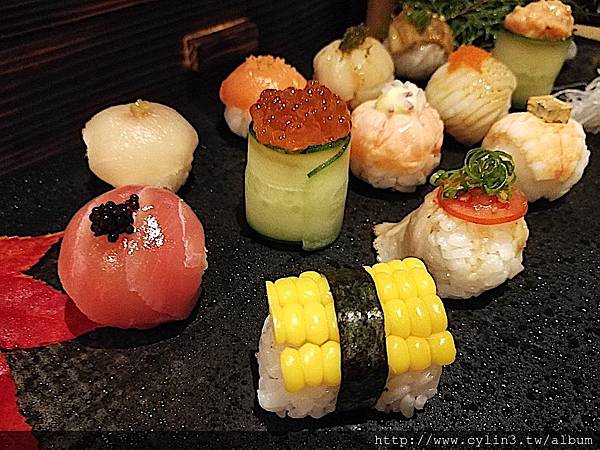 這道菜一上桌立刻吸引我們的目光,擺盤漂亮,握壽司顏色繽紛又嬌小可愛,每一個都是不同口味,但細節可是一點都不馬虎喔~完全打動最愛嚐鮮我的心了,聽說不少客人來訪也會先點這道料理,再依據個人喜好進階點正常版的握壽司;胖胖顰覺得每一個都新鮮好吃,尤其對玉米海苔握壽司與鮭魚卵軍艦握壽司更是印象深刻,玉米與小黃瓜都好鮮甜多汁啊~