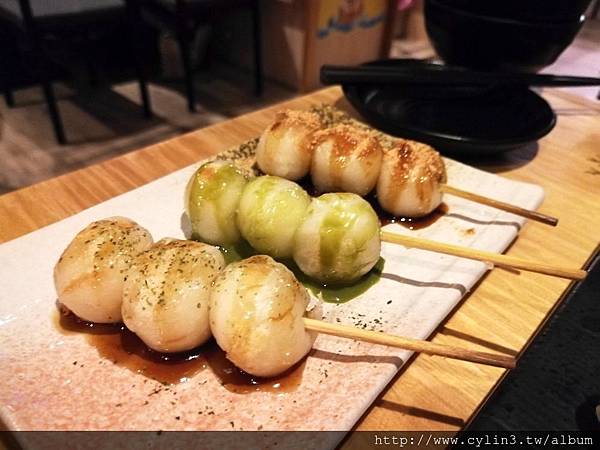 烤糰子Q彈有嚼勁,我們這日吃了三種口味,口味由左到右:醬油、抹茶、黑糖。