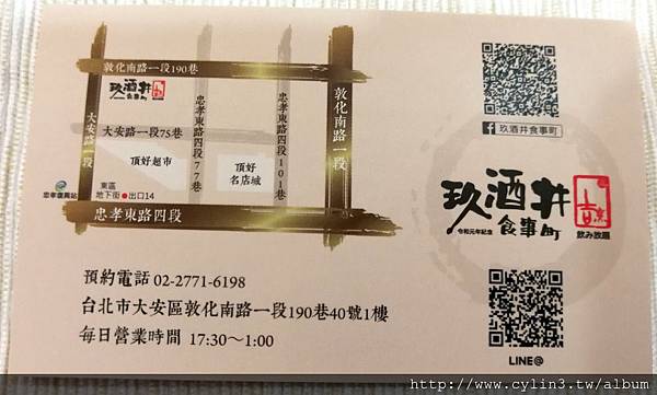 歲末有各式各項的聚餐好理由:聖誕交換禮物、尾牙Party、感恩聚會...等,新開幕的大安區串燒餐廳「玖酒井 食事町(大安店) 」是朋友M吃過驚艷推薦給我的,這日找了Janice一起來訪,它位於忠孝復興站與忠孝敦化站之間,鄰近東區麥當勞附近,走路約5分鐘即可到達,很方便!附上地圖給大家看看~