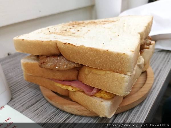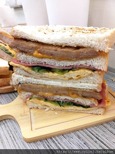 巨無霸三明治:豬排、有機雞蛋、起司、洋火腿、手醃黃瓜、美乃滋、3片鮮奶湯種吐司;給大家看看全照與疊起來的斷面照,我覺得一個女生來說大概可以當早午餐吧~哈
