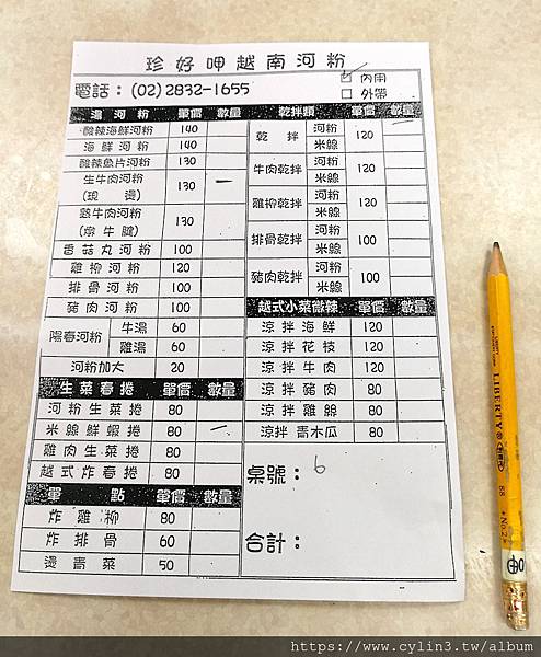 「珍好呷越南河粉」販售的越南料理頗單純,主要大項目為:湯河粉、生菜春捲、乾拌類、越式小菜微辣、單點,詳細就請大家自行參考照片囉~但光看文字還是不知道該如何選擇嗎?沒關係,在一旁牆壁上店家貼心的有提供熱門商品的圖片供參考。
