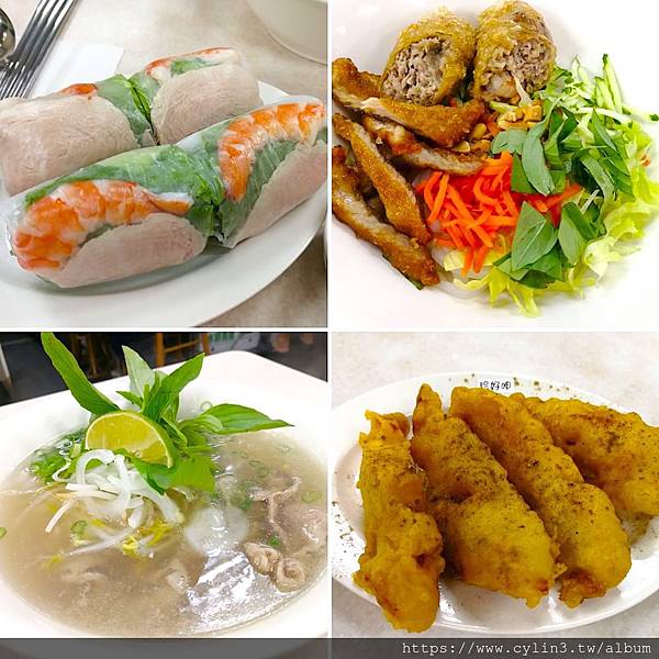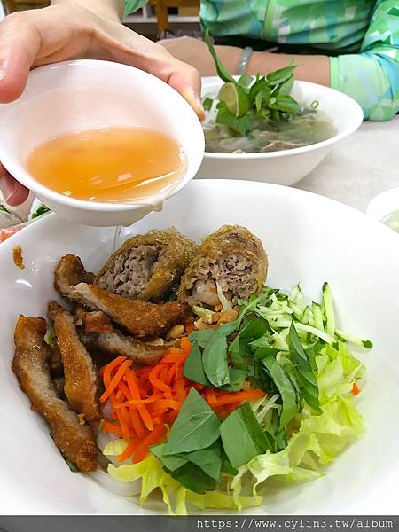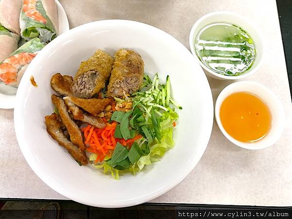 「乾拌河粉」也是我看圖點的超人氣商品,份量也是十足,炸的酥脆厚實的排骨、越式炸春捲以及些許蔬菜鋪在河粉上,一旁就是酸甜的越式淋醬與附的湯;排骨與越式炸春捲都好好吃,尤其是越式炸春捲,裡面竟然還有芋頭、鮮蝦耶~老闆表示這是他們自己做的,胖胖顰一吃驚為天人,超愛的,超級推薦大家千萬別錯過!