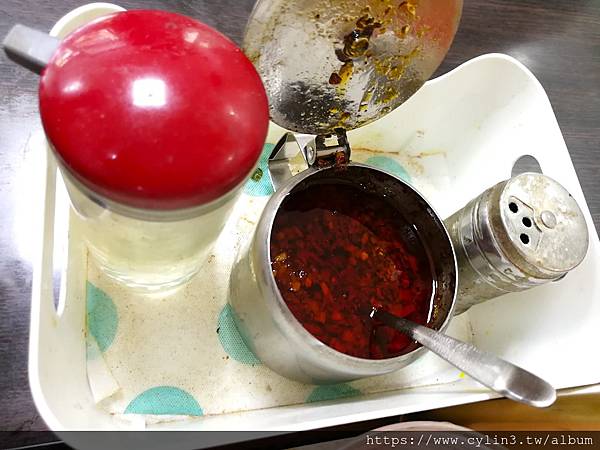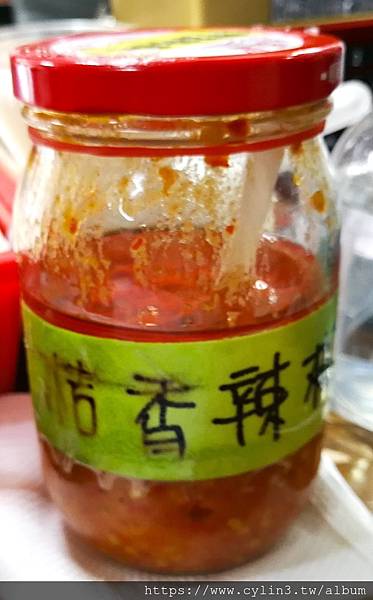 這罐「桔香辣椒」感覺在呼喚我,正當我要準備扭開瓶罐蓋時,店家忽然提醒我,我點的餐點比較適合加下圖常見的紅油辣椒,ㄜ~我只好乖乖聽店家建議,避免口味不佳!對於「桔香辣椒」的好奇心,只能待下次來訪時被滿足了。
