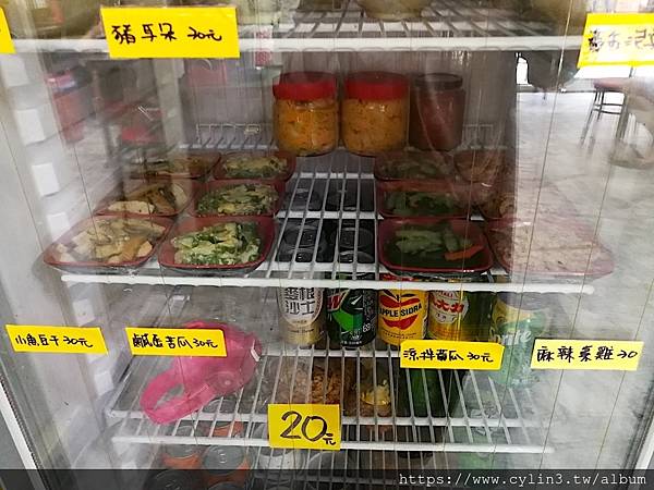 一旁還有一台冰箱,冰箱內除了飲品,還有「現燙涼麵王」的小菜,看起來頗可口。