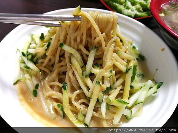 涼麵上撲滿滿的小黃瓜絲,再淋上屬於水水狀的胡麻醬,麵條屬於細的油麵,麵體Q彈,整體味道屬於偏清淡的,養生的朋友應該會喜歡,口味比較重的朋友建議可以淋上店家特製「桔香辣椒」,味道呈現會變得較多元,特殊桔香香氣真的好厲害,胖胖顰好像問問老闆有沒有單賣「桔香辣椒」。