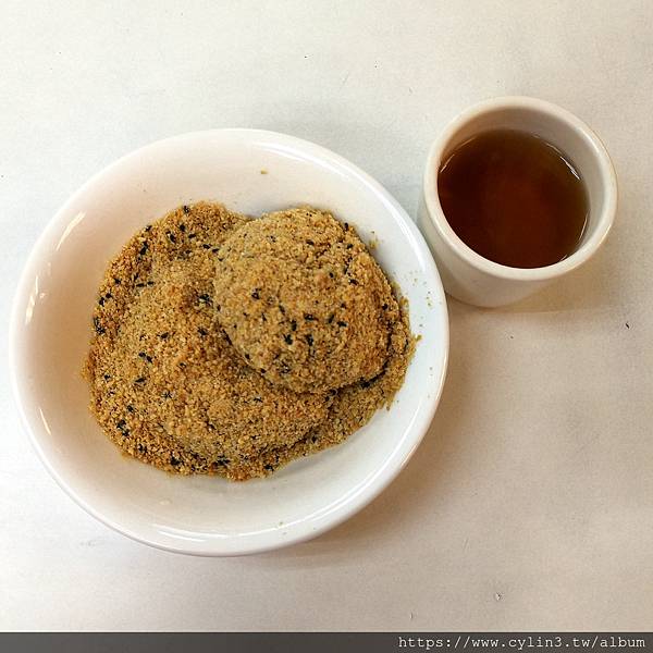 不一會QQ麻糬(燒麻糬)就上桌了,店家附的熱茶是烏龍茶,茶香醇厚,老闆娘說可以免費續杯,外送也會附,我覺得這茶我真的很喜歡,入喉回甘很好喝也很解膩,超加分滴~