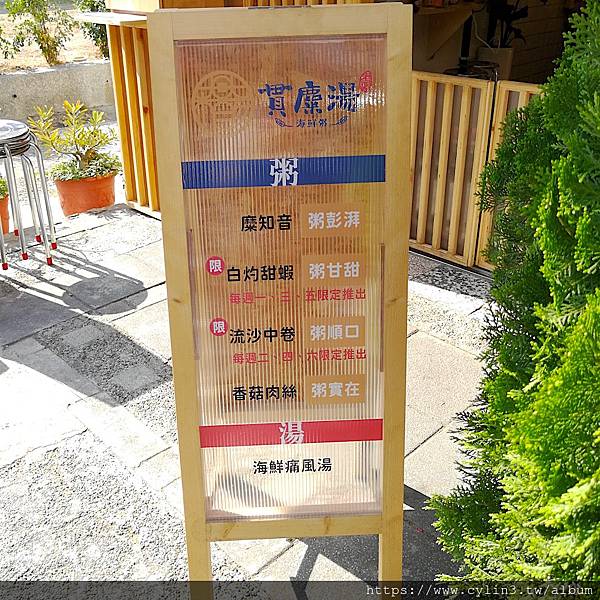 「老莫貫糜湯」店外就有塊招牌寫著販售的商品,商品很簡單,主要就是粥與湯兩大項目,湯目前只有推出「海鮮痛風湯」,粥目前內用有四種選擇:麋知音、白灼甜蝦(每週一、三、五限定)、流沙鮮魷(每週二、四、六限定)、香菇肉絲,ㄜ...如果想把全品項吃到得跑兩趟哩~