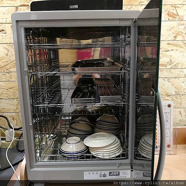 櫃檯後方即是開放看得到的料理區,老闆把糜粥的料一碗碗的事先準備好放在玻璃冷藏櫃內,衛生整潔又加快烹煮的時間,碗筷擺在有紫外線殺菌的烘碗機內,也讓人很安心。