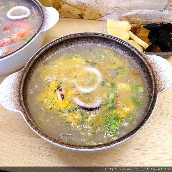 這碗「粥澎湃」,內容有:鮮魷與店家自製的獨門金莎醬,食材看似簡單卻一點也不簡單喔~店家獨門金莎醬用料大量不手軟,讓平淡的「糜粥(粥)」滋味與香氣更提升,加上特選鮮魷自然鮮甜,咬起來富有彈性,我們都覺得口味很獨特,尤其是身為家庭煮婦的菁姊喜愛的不得了,還忍不住一直想探詢店家如何熬煮,想回家試試看。